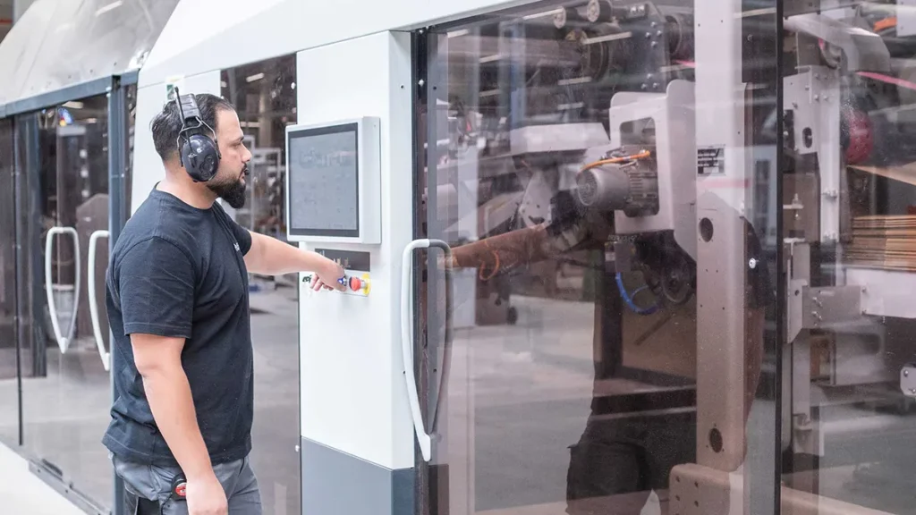 State-of-the-Art Maschinenpark: Fünf Produktionslinien (Baujahre 2017–2023): Drei Inliner, eine Rotationsstanze und eine Falt-Klebe-Maschine